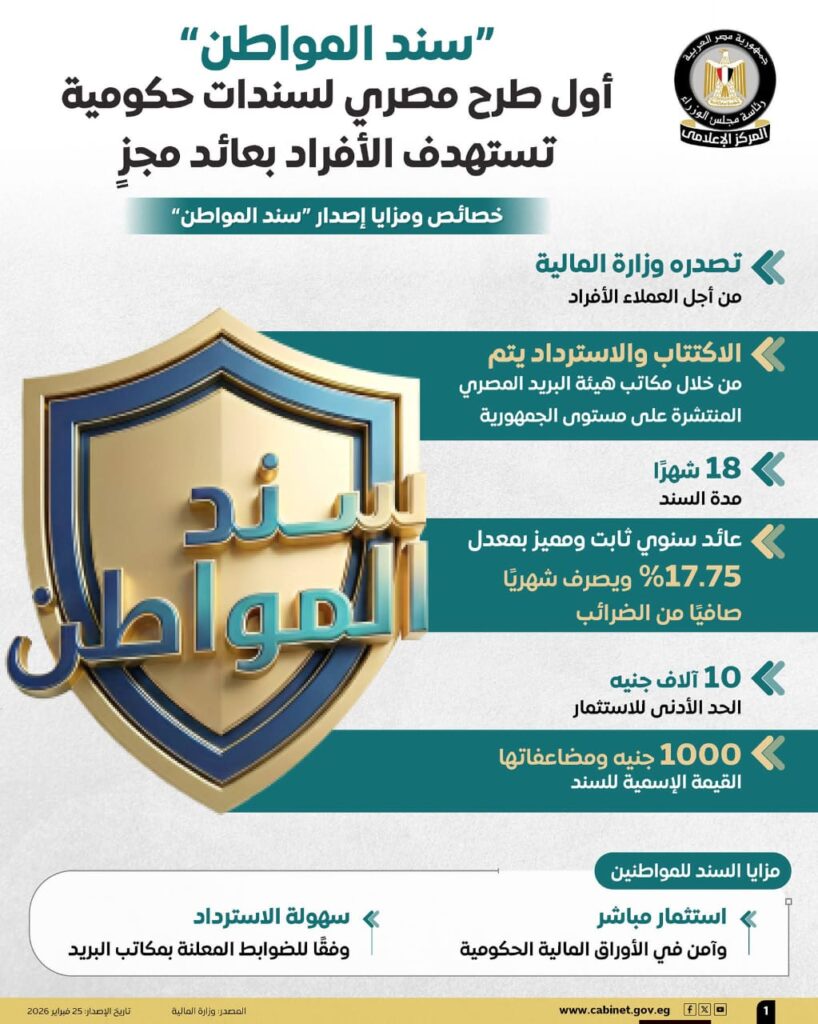 وقال المركز إن إطلاق هذا السند يأتي في إطار خطة حكومية تستهدف توسيع قاعدة مشاركة المواطنين في أدوات الاستثمار الآمن، من خلال إتاحة منتج استثماري يتميز بدرجة عالية من الأمان وسهولة الاسترداد، كما يعتمد الطرح في مرحلته الأولى على شبكة مكاتب هيئة البريد المصري باعتبارها المنفذ الحصري لبيع السند، بما يضمن سهولة الإجراءات وجودة الخدمة، ويسهم في دعم جهود الدولة لتعزيز الشمول المالي، وتوسيع نطاق الوصول إلى الأدوات الادخارية والاستثمارية في جميع المحافظات.