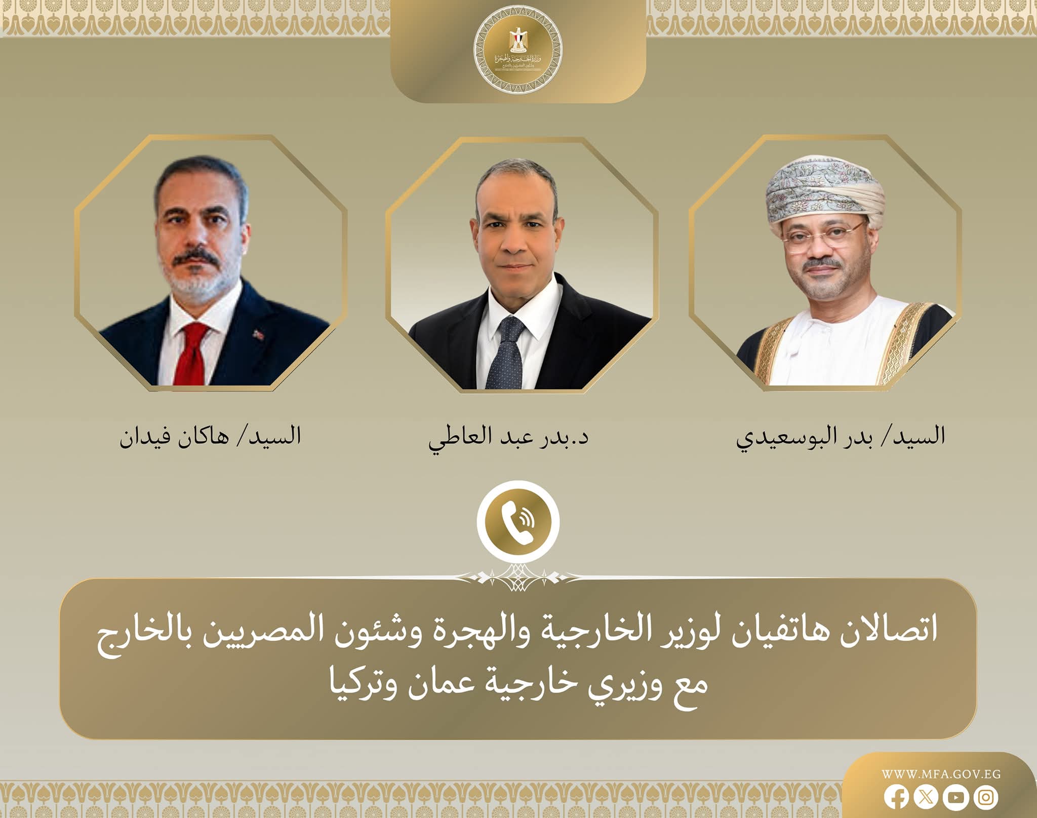 جرى اتصالان هاتفيان بين د. بدر عبد العاطي وزير الخارجية والهجرة وكل من السيد/ بدر بن حمد البوسعيدي وزير خارجية سلطنة عُمان، والسيد/ هاكان فيدان وزير خارجية الجمهورية التركية، وذلك فى إطار متابعة التطورات المتسارعة في المنطقة. تم استعراض خلال الاتصالين التطورات المقلقة في الإقليم، وتبادل التقييمات حول تداعياتها الوخيمة على أمن واستقرار المنطقة، وتم التوافق على أهمية تكاتف الجهود الإقليمية والدولية لخفض حدة التوتر واحتواء التصعيد بالمنطقة، أخذًا في الاعتبار خطورة الوضع القائم وعواقبه. كما تم التأكيد على ضرورة احترام القانون الدولي وميثاق الأمم المتحدة، وعدم المساس بسيادة الدول وسلامة أراضيها، وأنه لا حلول عسكرية للأزمات الإقليمية، وأن السبيل الوحيد لاحتواء التوتر يرتكز على بذل الجهود الدبلوماسية والسياسية لتجنيب الإقليم مزيد من مظاهر عدم الاستقرار.