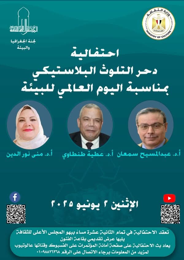 ينظم المجلس الأعلى للثقافة، التابع لوزارة الثقافة، احتفالية خاصة بعنوان "دحر التلوث البلاستيكي"، وذلك بمناسبة اليوم العالمي للبيئة، في تمام الساعة الثانية عشرة ظهر يوم الاثنين الموافق 2 يونيو 2025، بالمجلس الأعلى للثقافة.