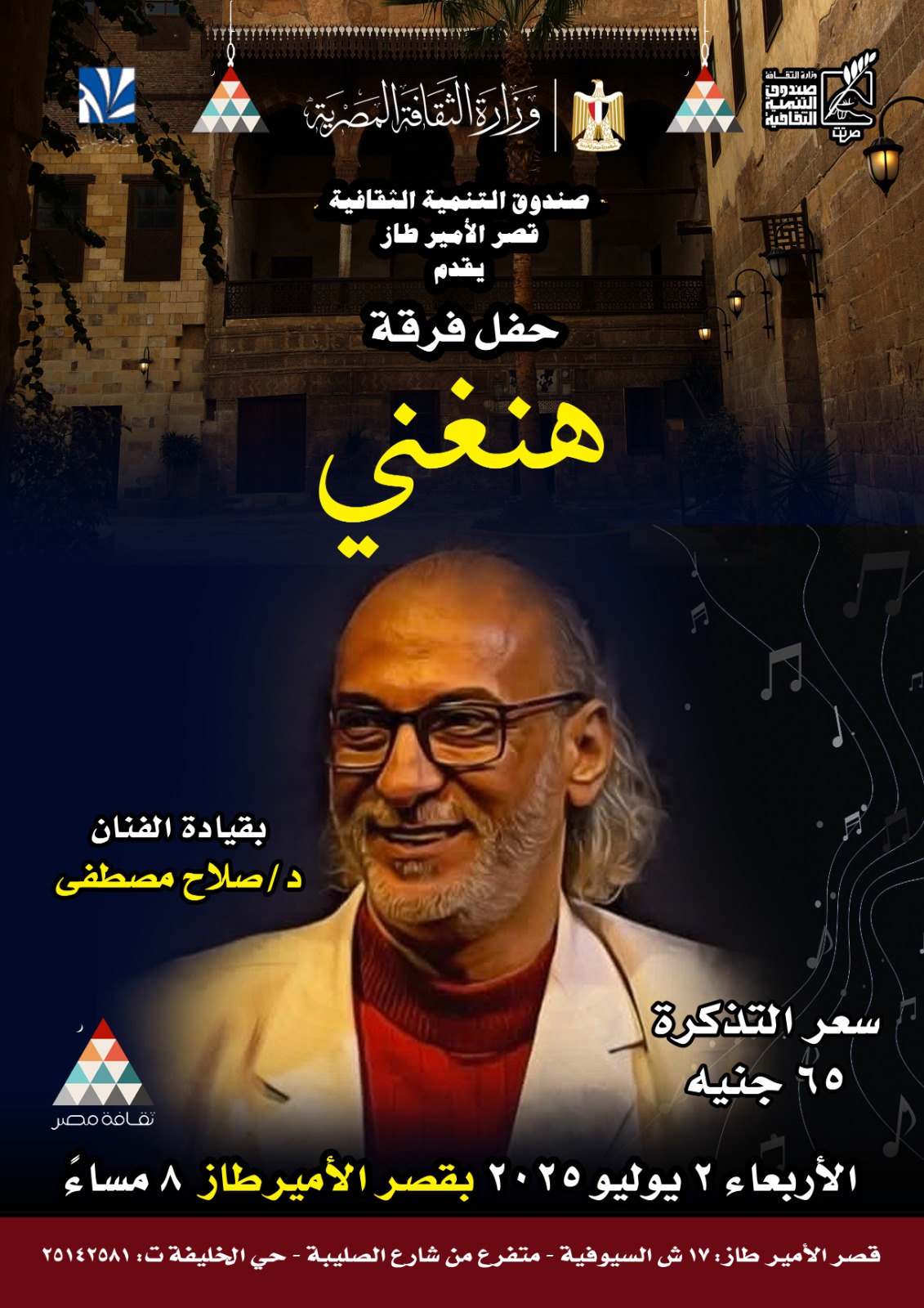 في إطار البرنامج الثقافي والفني الذي يقدمه قطاع صندوق التنمية الثقافية خلال شهر يوليو الجاري.. ينظم قصر الأمير طاز بحي الخليفة، أمسية موسيقية لفرقة "هنغني" بقيادة الدكتور صلاح مصطفى، وذلك في تمام الثامنة مساء غداً (الاربعاء 2 يوليو). تُقدم الفرقة خلال الأمسية باقة من الأغاني الطربية والمقطوعات الغنائية المختارة، في تجربة فنية تفاعلية تسعى إلى استعادة دور الفن الجاد في الارتقاء بالذوق العام، ومواجهة موجات الإسفاف من خلال مشاركة الجمهور في الأداء، وتقديم محتوى موسيقي يتسم بالرصانة والتنوع. تعود نشأة الفرقة قبل ٥ سنوات تحت مسمى "فِكرة"، حيث تضم الفرقة مجموعة من الأصوات الشابة، التي تلقت تدريبًا متخصصًا على مدار عام كامل، بهدف تقديم نموذج غنائي متكامل يجمع بين الجودة الفنية والانفتاح على الجمهور. وقد سجلت "هنغني" خلال السنوات الماضية حضورًا مميزًا في عدد من الفعاليات الرسمية والثقافية، من بينها حفلات برئاسة الجمهورية، وجامعة القاهرة، فضلًا عن مشاركتها في فعاليات الشؤون المعنوية والعديد من الجهات الأخرى. وأكد الفنان د. صلاح مصطفى أن توفير الدعم المؤسسي من قبل صندوق التنمية الثقافية كان حاسمًا في تمكين الفرقة من مواصلة مسيرتها، مشيرًا إلى أهمية دور المؤسسات الثقافية في رعاية المواهب وتوفير مناخ احترافي يليق بطموحات الفنانين الشباب، ويسهم في تعزيز دور القوى الناعمة للدولة. يأتي هذا الحفل في سياق الفعاليات المنتظمة التي يشهدها قصر الأمير طاز، أحد أبرز المراكز الثقافية التابعة لصندوق التنمية الثقافية، والذي يحتضن على مدار العام عددًا من الفعاليات الهادفة التي تربط بين التراث والحداثة، وتُسهم في تنشيط المشهد الثقافي في قلب القاهرة التاريخية.