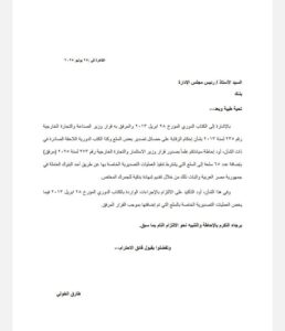 كما جاء ذلك بالإشارة إلى الكتاب الدوري المؤرخ 28 ابريل 2013 والمرفق به قرار وزير الصناعة والتجارة الخارجية رقم 235 لسنة 2013 بشأن إحكام الرقابة على حصائل تصدير بعض السلع وكذا الكتب الدورية اللاحقة الصادرة في ذات الشأن.