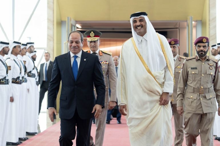 وكان في مقدمة مستقبلي الرئيس السيسي لدى وصوله إلى مطار حمد الدولي، تميم بن حمد آل ثاني أمير دولة قطر، إلى جانب محمد بن عبدالرحمن بن جاسم آل ثاني رئيس مجلس الوزراء وزير الخارجية القطري، وعبدالله بن محمد الخليفي رئيس الديوان الأميري القطري، وعدد من كبار المسؤولين.