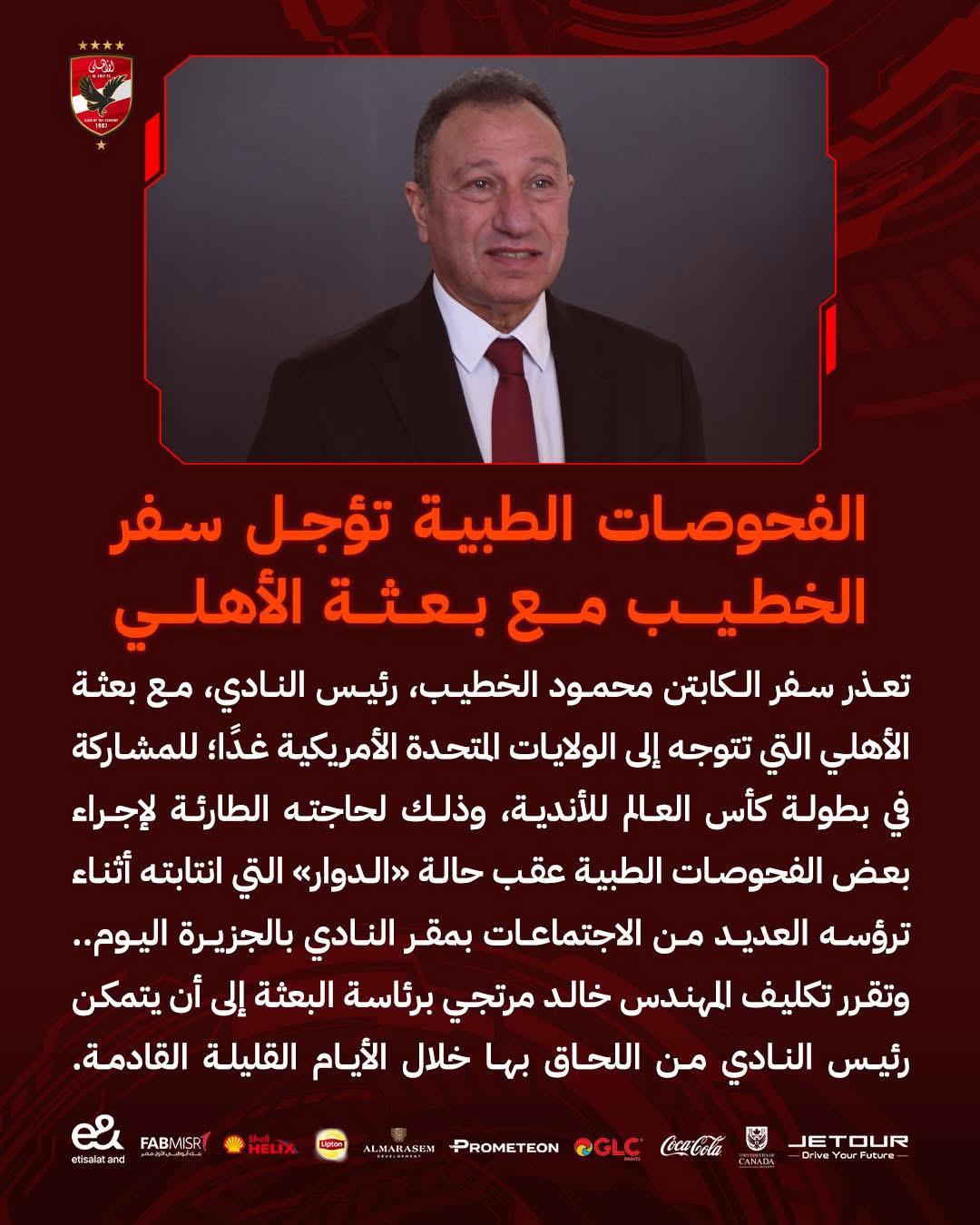 أعلن النادي الأهلي اليوم الثلاثاء، عبر الصفحة الرسمية على الفيس بوك، أن رئيس النادي محمود الخطيب قرر تأجيل سفره مع بعثة الفريق المتجهة غداً إلى الولايات المتحدة الأمريكية لخوض منافسات بطولة كأس العالم للأندية، وذلك لإجراء بعض الفحوصات الطبية نتيجة حالة "الدوار" اثر بعض الاجتماعات التي خاضها اليوم بمقر النادي بالجزيرة. خالد مرتجي رئيساً لبعثة الأهلي بدلاً من الخطيب وقرر تكليف المهندس خالد مرتجي برئاسة البعثة، لحين الالتحاق بهم بعد الانتهاء من الفحوصات الطبية اللازمة. مشوار الأهلي في كأس العالم للأندية ويفتتح النادي الأهلي مشواره في كأس العالم للأندية يوم 14 يونيو من الشهر الجاري بمواجهة صاحب الأرض فريق إنتر ميامي الأمريكي، ثم يخوض ثاني مبارياته أمام فريق بالميراس البرازيلي يوم 19 يونيو من الشهر ذاته، ويختتم دور المجموعات بمواجهة هي الأصعب أمام بورتو البرتغالي يوم 24 يونيو الجاري