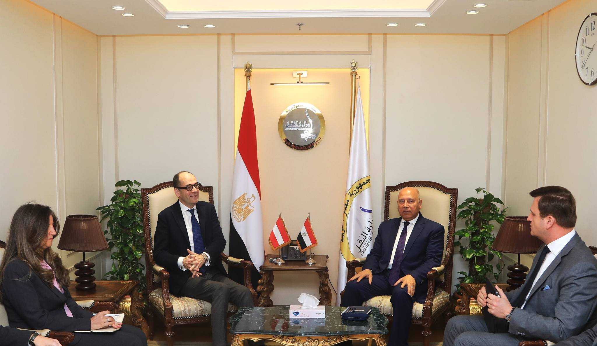 التقى الفريق مهندس كامل الوزير، وزير النقل، بالسيد ماكس تريور، الرئيس التنفيذي لشركة بلاسر النمساوية، بحضور جورج بوستينجر، سفير النمسا بالقاهرة، لمناقشة آليات تعزيز التعاون بين مصر وشركة بلاسر في مجال تطوير البنية التحتية للسكك الحديدية، وإنشاء مركز إقليمي لصيانة ماكينات تجديدات السكة وإنتاج قطع غيارها، بالإضافة إلى إجراء عمرات ماكينات السكك الحديدية القائمة.