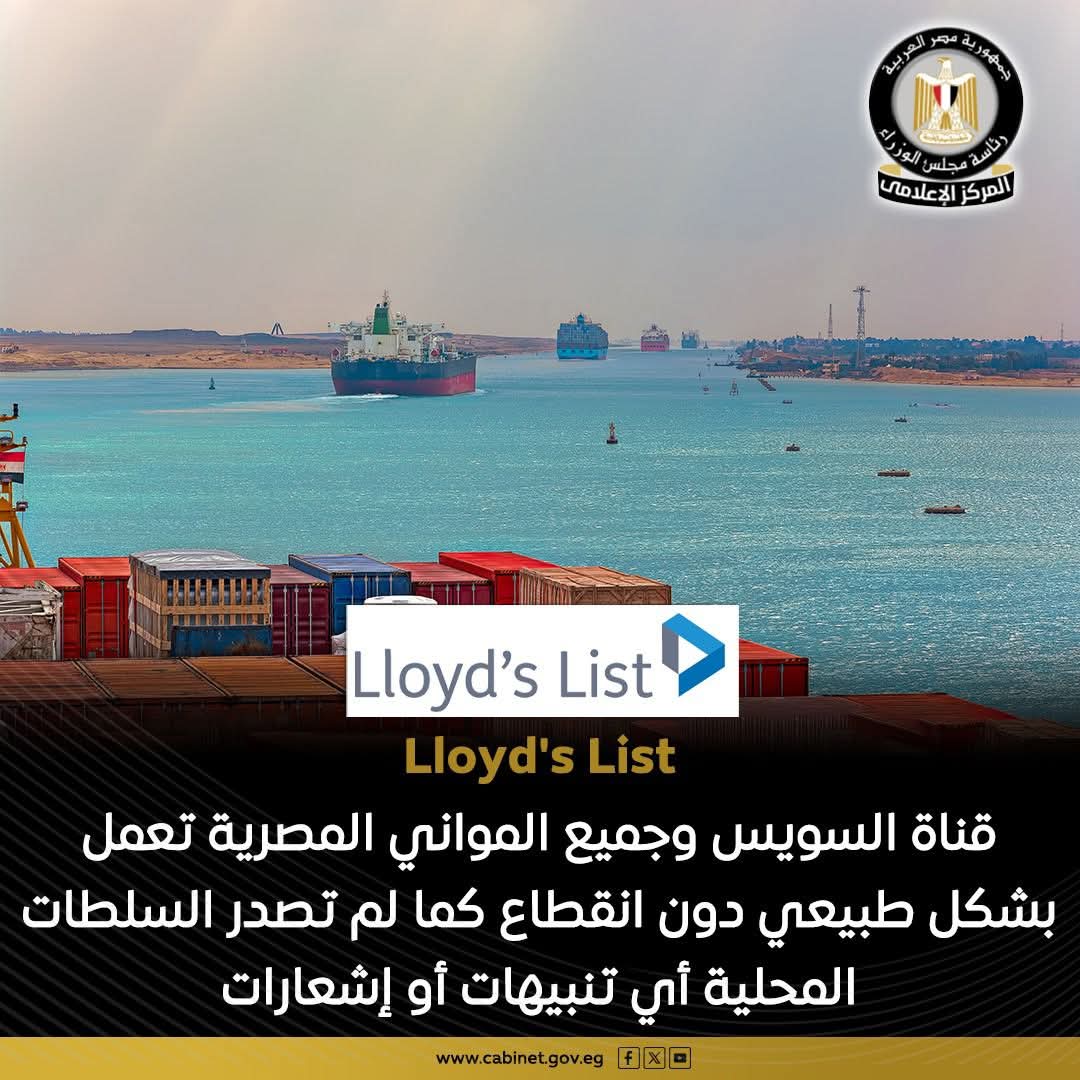 في تقريرها الصادر بشكل يومي بشأن حركة الملاحة في مواني الشرق الأوسط أكدت منصة Lloyd’s List أن قناة السويس وجميع المواني المصرية لم تتأثر بالتوترات الإقليمية في الشرق الأوسط، حيث تعمل بشكل طبيعي دون انقطاع، كما لم تصدر السلطات المحلية أي تنبيهات أو إشعارات.