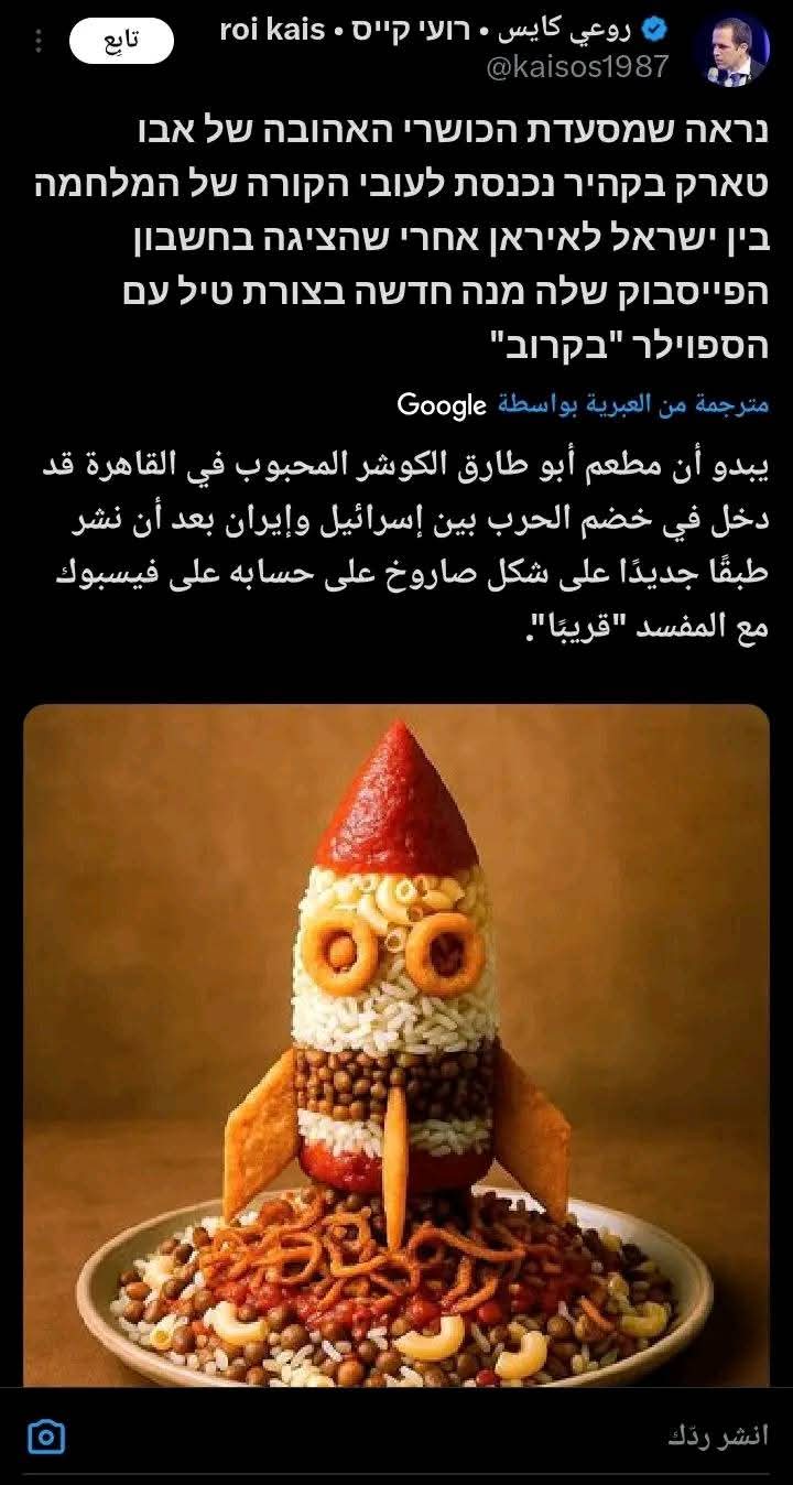 وسط تصاعد التوتر بين إيران وإسرائيل، تداولت مواقع التواصل الاجتماعي منشورات ساخرة تشير إلى دخول مطعم “كشري أبو طارق” الشهير في مصر على “خط المواجهة”، عبر ما أُطلق عليه ساخرًا “صاروخ العدس والمكرونة”. وجاءت المزحة عقب تقرير نقلته هيئة البث الإسرائيلية تناول التفاعل الواسع مع هذه النكتة، التي اعتبرها البعض رمزًا شعبيًا ساخرًا للمقاومة بنكهة مصرية، حيث زعمت التعليقات الساخرة أن المطعم يشارك في الصراع بسلاحه الأشهر: وجبة الكشري. ورغم الطابع الكوميدي للمزاعم، أصدر مطعم “كشري أبو طارق” بيانًا عبر صفحاته الرسمية على مواقع التواصل الاجتماعي نافياً أي علاقة له بالصراعات السياسية أو العسكرية، ومؤكداً أن رسالته تقتصر على تقديم الطعام فقط. وقال المطعم في بيانه: “إحنا بنشبع الناس، مش بنفجرهم.. الكشري سلاح للمحبة، مش للدمار!” وأضاف مازحًا: “وصلنا إن العدس بقى مرعب، وإن المكرونة مصنفة كصاروخ.. بنطمن الجميع إن وجبتنا الوحيدة هي وجبة الشبع والسعادة، ومفيش أي نية لاستخدام البصل المقلي إلا في الطبق!” واختتم المطعم بيانه برسالة طريفة: “رسالتنا من وسط القاهرة واضحة: هنفضل نحارب الجوع.. مش الناس!”