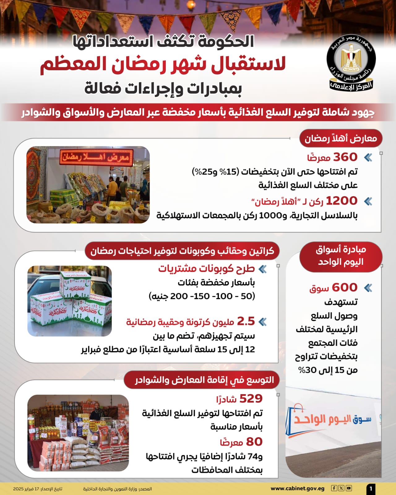 أكد المركز الإعلامي لمجلس الوزراء استعدادات الحكومة لاستقبال شهر رمضان المعظم عبر حزمة من المبادرات والإجراءات الهادفة إلى إتاحة السلع الأساسية بأسعار مخفضة، والتوسع في المنافذ والمعارض لتلبية احتياجات مختلف الفئات، وذلك بالتنسيق بين مختلف الجهات المعنية.