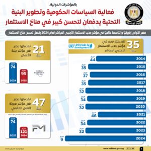 نشر المركز الإعلامي لمجلس الوزراء عددًا من الإنفوجرافات عبر منصاته الرسمية على مواقع التواصل الاجتماعي، سلط من خلالها الضوء على التحسن الملحوظ الذي يشهده مناخ الاستثمار بمصر، مدفوعًا بفعالية السياسات الحكومية وجهود تطوير البنية التحتية، وذلك استنادًا إلى مؤشرات دولية. ويأتي هذا التحسن في دلالة واضحة على نجاح جهود الدولة في تحسين بيئة الأعمال وتعزيز ثقة المستثمرين، حيث واصل مناخ الاستثمار تحقيق تقدم ملحوظ على المستوى الدولي، مدعومًا بإصلاحات اقتصادية ومؤسسية ومشروعات بنية تحتية كبرى نُفذت خلال السنوات الأخيرة، أسهمت في تعزيز قدرة الاقتصاد على جذب الاستثمارات وتحقيق مستويات أعلى من التنافسية والاستقرار. وأظهرت الإنفوجرافات تصدر مصر قائمة الدول الأفريقية في مؤشر جذب الاستثمار الأجنبي المباشر لعام 2024، بجانب احتلالها المركز التاسع عالميًا بالمؤشر ذاته لعام 2024، مقارنة بالمركز 44 عالميًا في عام 2014، متقدمة بذلك 35 مركزًا، وفقًا لتقرير الاستثمار العالمي الصادر عن مؤتمر الأمم المتحدة للتنمية والتجارة “أونكتاد”. كما تقدمت مصر 21 مركزًا في مؤشر بيئة الأعمال، الصادر عن “المنتدى الاقتصادي العالمي – World Economic Forum”، لتصل إلى المركز 74 عام 2024، مقارنة بالمركز 95 عام 2015، وكذلك تقدمها 47 مركزًا في مؤشر مرونة العمل العالمي الذي يقيس قدرة الاقتصاد على امتصاص الصدمات والتعافي منها بسرعة، الصادر عن مؤسسة “FM GLOBAL”، لتحتل المركز 74 عام 2025، مقارنة بالمركز 121 عام 2014. وفيما يخص مؤشرات فعالية السياسات الحكومية، أحرزت مصر تقدمًا ملحوظًا بواقع 20 مركزًا في مؤشر الفعالية الحكومية الصادر عن “المنظمة العالمية للملكية الفكرية – WIPO”، لتصل إلى المركز 98 عام 2024، مقارنة بالمركز 118 عام 2014، فضلًا عن تقدمها 47 مركزًا في مؤشر تيسير الإجراءات الحكومية الصادر عن “المنتدى الاقتصادي العالمي”، لتحقق المركز 27 عام 2024، مقارنة بالمركز 74 عام 2019. كما تقدمت مصر 37 مركزًا في مؤشر البيئة التنظيمية الصادر عن “المنظمة العالمية للملكية الفكرية – WIPO”، لتحقق المركز 94 عام 2024، مقارنة بالمركز 131 عام 2014، إلى جانب تقدمها 27 مركزًا في مؤشر شفافية الموازنة، الصادر عن “International Budget Partnership”، لتحتل المركز 63 عام 2023، مقارنة بالمركز 90 عام 2015. وفي مؤشر جاهزية الحكومة للذكاء الاصطناعي، الصادر عن “Oxford Insights” حققت مصر تقدمًا بـ 46 مركزًا، لتحتل المركز 65 عام 2024، مقارنة بالمركز 111 عام 2019. وتواصل مصر تقدمها بمؤشرات فعالية السياسات الحكومية، حيث تقدمت 7 مراكز في مؤشر سيادة القانون الصادر عن “المنظمة العالمية للملكية الفكرية – WIPO”، لتصل إلى المركز 81 عام 2024، مقارنة بالمركز 88 عام 2014، كما تقدمت 63 مركزًا في مؤشر الأمن والأمان الصادر عن “المنتدى الاقتصادي العالمي”، لتحتل المركز 73 عام 2024، مقابل المركز 136 عام 2015. ولفتت الإنفوجرافات إلى تقدم مصر 19 مركزًا في مؤشر سير الأشخاص بمفردهم ليلًا الصادر عن “المنتدى الاقتصادي العالمي”، لتصل إلى المركز 10 عام 2024، مقارنة بالمركز 29 عام 2019، كما حققت تقدمًا بـ 38 مركزًا في مؤشر الدول الأكثر أمانًا الصادر عن “GLOBAL FINANCE”، لتصل إلى المركز 65 عام 2023، مقارنة بالمركز 103 عام 2019. وبشأن الطفرة الكبيرة بمؤشرات البنية التحتية، أشارت الإنفوجرافات إلى تقدم مصر 62 مركزًا في مؤشر البنية التحتية البرية والبحرية الصادر عن “المنتدى الاقتصادي العالمي”، محققة المركز 41 عام 2024، مقارنة بالمركز 103عام 2015، كما تقدمت 36 مركزًا في مؤشر البنية التحتية للنقل الجوي الصادر عن المنتدى ذاته، لتصل إلى المركز 27 عام 2024، مقارنة بالمركز 63 عام 2015. وفي مؤشر أداء الخدمات اللوجستية الصادر عن “البنك الدولي”، تقدمت مصر 5 مراكز، لتحتل المركز 57 عام 2023، مقارنة بالمركز 62 عام 2014، إلى جانب تصدرها إفريقيا بمؤشر البنية التحتية للمناطق الصناعية الذي يصدر لأول مرة عن “البنك الإفريقي للتنمية” بإجمالي 58.76 نقطة. وفيما يتعلق بالتحسن الملحوظ بمؤشرات الط