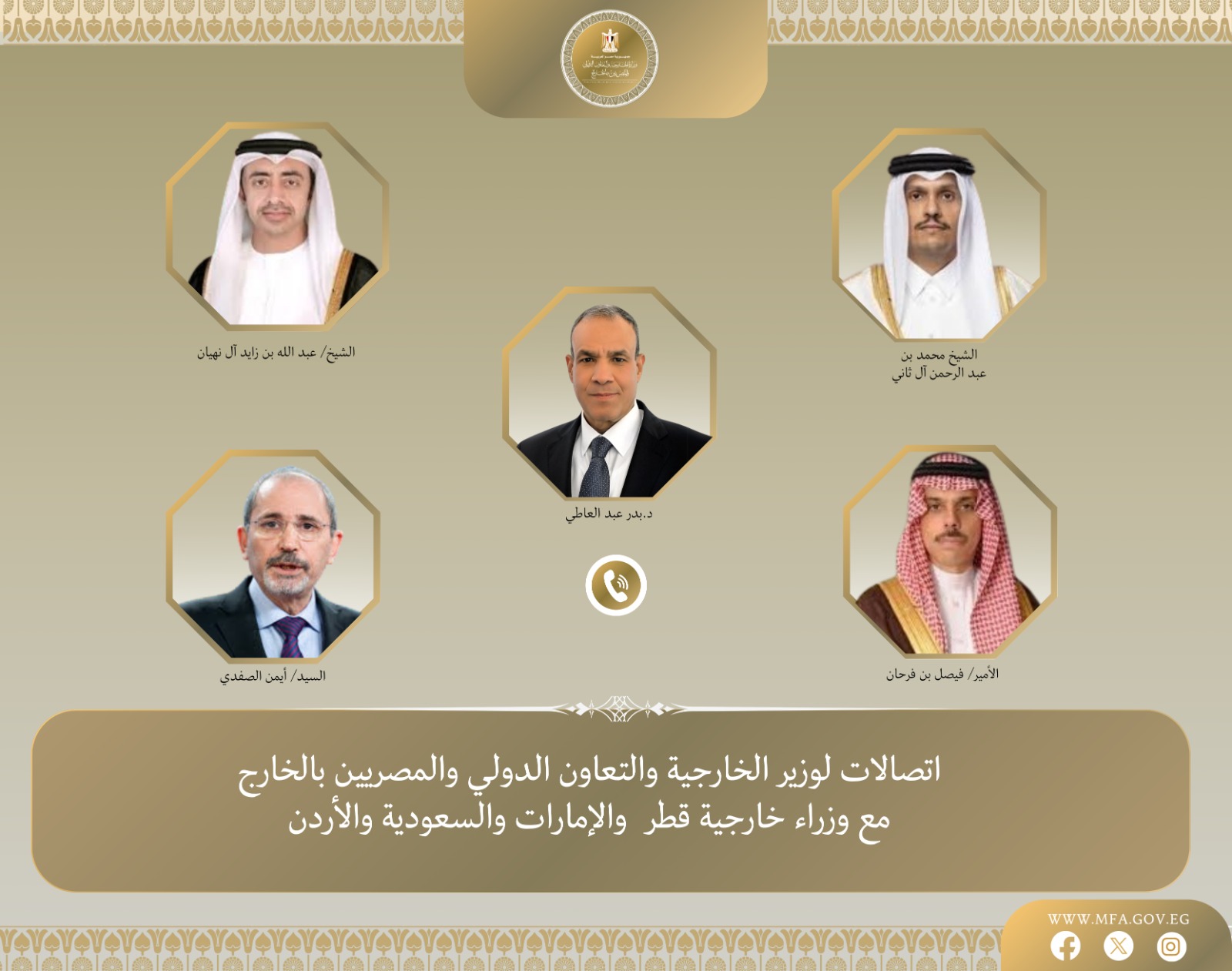 أجرى د. بدر عبد العاطي، وزير الخارجية والتعاون الدولي والمصريين بالخارج، سلسلة اتصالات هاتفية مكثفة مع عدد من نظرائه في الدول الشقيقة، شملت معالي الشيخ محمد بن عبد الرحمن وزير الخارجية القطري، وسمو الشيخ عبد الله بن زايد وزير خارجية الإمارات، وسمو الأمير فيصل بن فرحان وزير خارجية السعودية، والسيد أيمن الصفدي وزير خارجية الأردن.