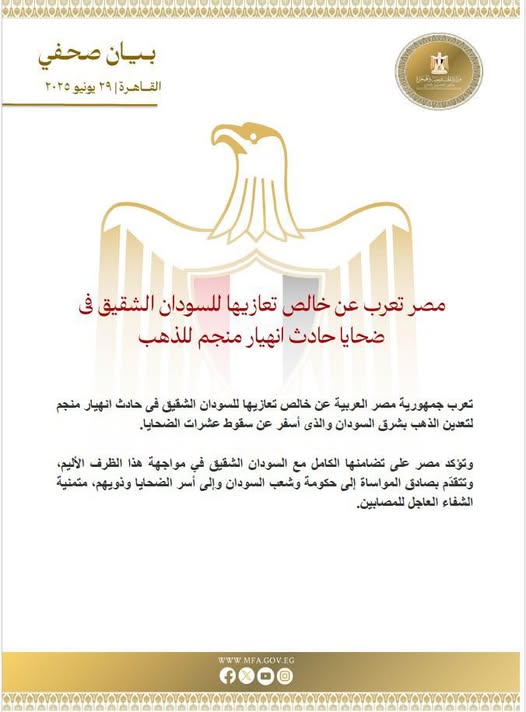 أعربت مصر عن خالص تعازيها للسودان الشقيق في حادث انهيار منجم لتعدين الذهب بشرق السودان والذي أسفر عن سقوط عشرات الضحايا.
