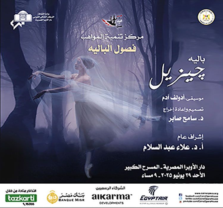 ضمن فعاليات وزارة الثقافة تنظم دار الأوبرا المصرية برئاسة الدكتور علاء عبد السلام حفلاً للدارسين بفصول الباليه بمركز تنمية المواهب يعرضون خلاله الباليه الكلاسيكى الرومانسى جيزيل تصميم واعادة اخراج للدكتور سامح صابر وذلك فى التاسعة مساء الاحد ٢٩ يونيو على المسرح الكبير .