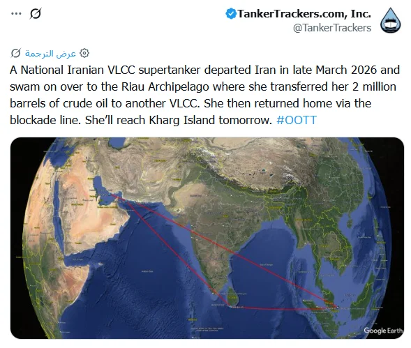 كشف موقع “تانكر تراكرز” أن ناقلة نفط إيرانية عملاقة نجحت في اختراق الحصار البحري الأمريكي لمضيق هرمز، وعادت الآن في طريقها إلى إيران.