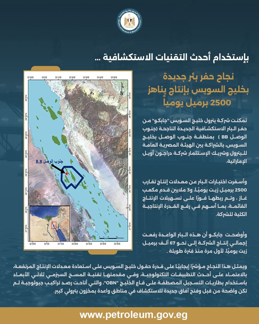 تمكنت شركة بترول خليج السويس “جابكو” من حفر البئر الاستكشافية الجديدة الناجحة ( جنوب الوصل BB ) بمنطقة جنوب الوصل بخليج السويس، بالشراكة بين الهيئة المصرية العامة للبترول وشريك الإستثمار شركة دراجون أويل الإماراتية.