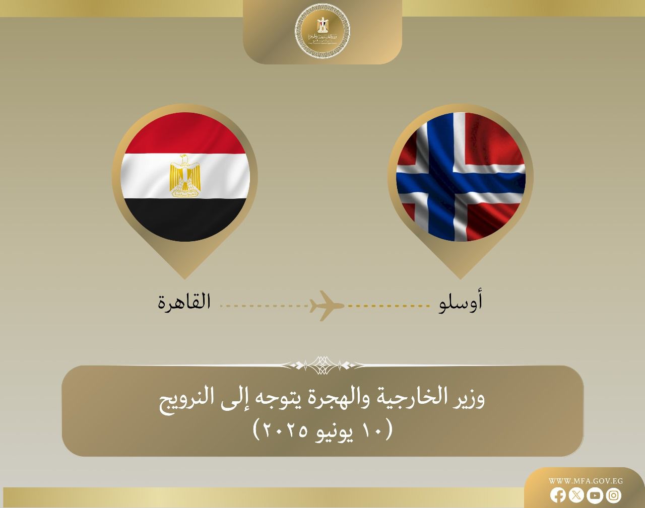 توجه د. بدر عبد العاطى وزير الخارجية والهجرة يوم الثلاثاء ١٠ يونيو إلى النرويج للمشاركة في "منتدى أوسلو" المقرر عقده يوم ١١ يونيو. ويعقد وزير الخارجية سلسلة من اللقاءات الثنائية على هامش المنتدى لبحث سبل تعزيز العلاقات الثنائية بين مصر والنرويج، وكذلك لتبادل الرؤى مع الوزراء والمسئولين الدوليين إزاء مختلف التطورات الإقليمية والدولية.